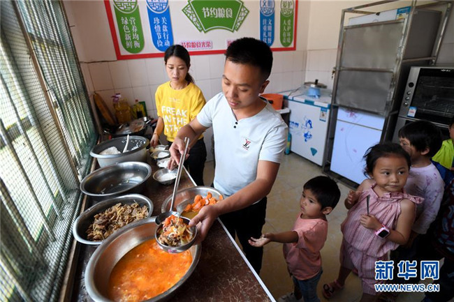 9月5日,十八洞小學(xué)學(xué)生在排隊(duì)等候老師盛飯菜。新華社記者 陳澤國 攝