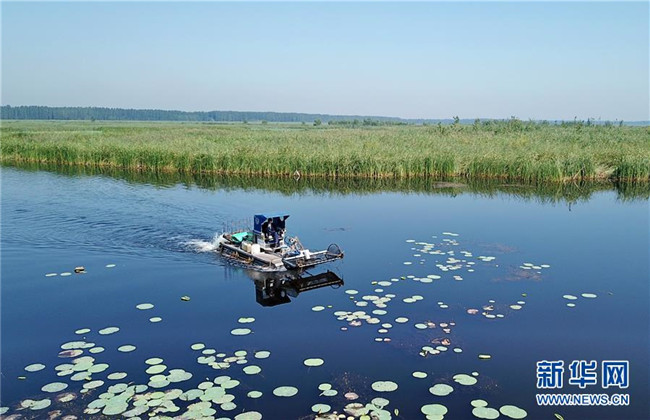 一艘打撈船在白洋淀景區(qū)內(nèi)清理漂浮物(8月31日無人機(jī)拍攝)。新華社記者 牟宇 攝
