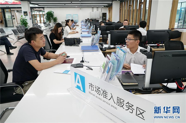 企業(yè)工作人員在雄安新區(qū)政務(wù)服務(wù)中心內(nèi)辦理業(yè)務(wù)(8月30日攝)。新華社記者 牟宇 攝