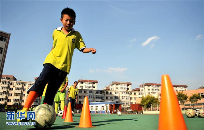 9月5日,在承德市雙橋區(qū)東園林小學(xué),學(xué)生在練習(xí)帶球。