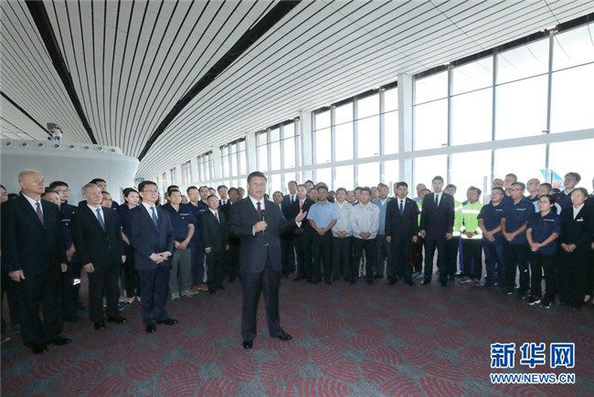 9月25日上午,北京大興國際機場投運儀式在北京舉行。中共中央總書記、國家主席、中央軍委主席習(xí)近平出席儀式,宣布機場正式投運并巡覽航站樓。這是習(xí)近平看望參與機場建設(shè)和運營的工作人員代表,同他們親切交談。 新華社記者 鞠鵬 攝