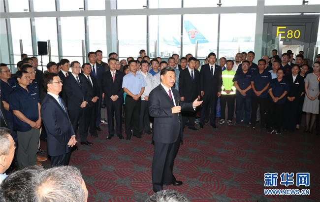 大興機場航站樓,是目前全球最大規(guī)模的單體航站樓,以其獨特的造型設(shè)計、精湛的施工工藝、便捷的交通組織、先進的技術(shù)應(yīng)用,創(chuàng)造了許多世界之最。航站樓里,流線型的空間結(jié)構(gòu)十分寬敞明亮。習(xí)近平步行巡覽站臺大廳和值機大廳,實地了解值機、安檢、登機和殘疾人無障礙設(shè)施等情況,并結(jié)合沙盤和模型聽取機場總體規(guī)劃、設(shè)施建設(shè)等介紹。習(xí)近平強調(diào),大興國際機場是首都的重大標(biāo)志性工程,是推動京津冀協(xié)同發(fā)展的骨干工程。京津冀三地要抓住機遇加強協(xié)同合作,加快推動地區(qū)高質(zhì)量發(fā)展。民航業(yè)是國家重要的戰(zhàn)略產(chǎn)業(yè)。要建設(shè)更多更先進的航空樞紐、更完善的綜合交通運輸系統(tǒng),加快建設(shè)交通強國。