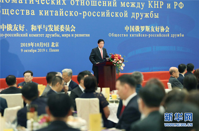 10月9日,全國(guó)對(duì)外友協(xié),中俄友好、和平與發(fā)展委員會(huì),中俄友協(xié)在北京人民大會(huì)堂舉行慶祝中俄建交暨中俄友協(xié)成立70周年招待會(huì)。中共中央政治局常委、全國(guó)人大常委會(huì)委員長(zhǎng)栗戰(zhàn)書(shū)出席并致辭。 新華社記者 劉衛(wèi)兵 攝