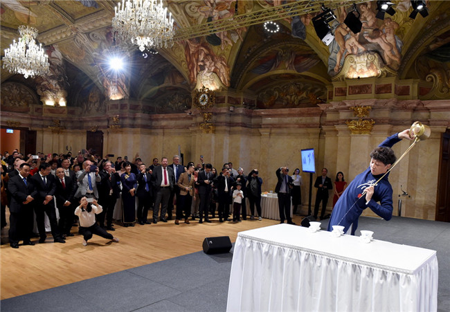 10月9日,在奧地利首都維也納“文化中國、錦繡四川”四川文化旅游展示會(huì)上,人們觀看茶藝表演。