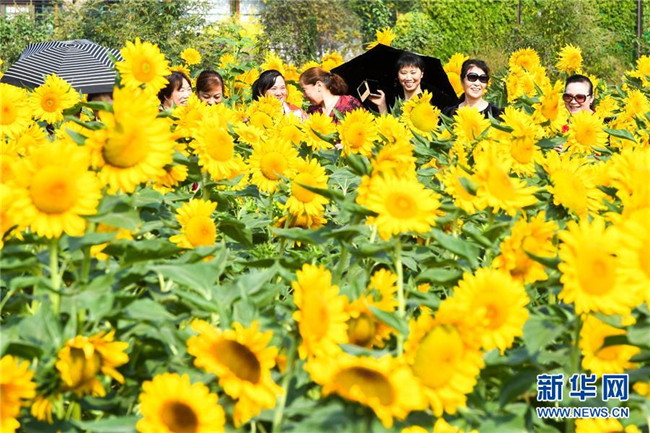 10月10日,游客在湖南省森林植物園的向日葵花海中漫步賞花。新華社記者 陳澤國 攝