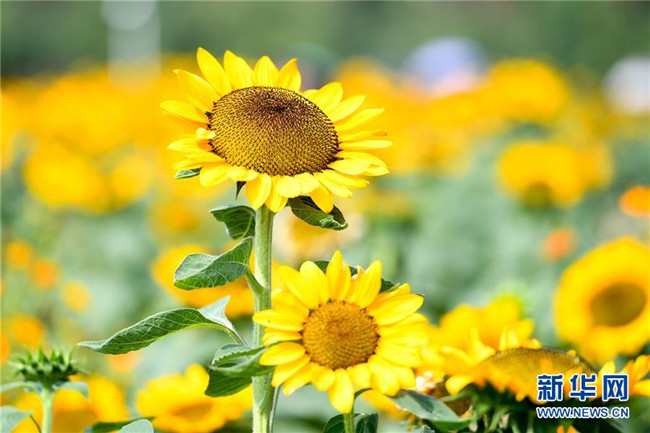 近日,位于長沙市的湖南省森林植物園中的向日葵在秋陽下競相綻放,黃花綠葉交相輝映,吸引眾多市民、游客前來觀賞。
