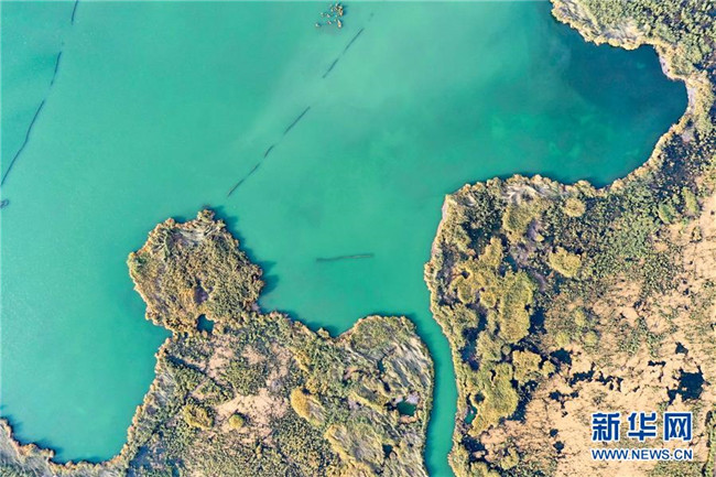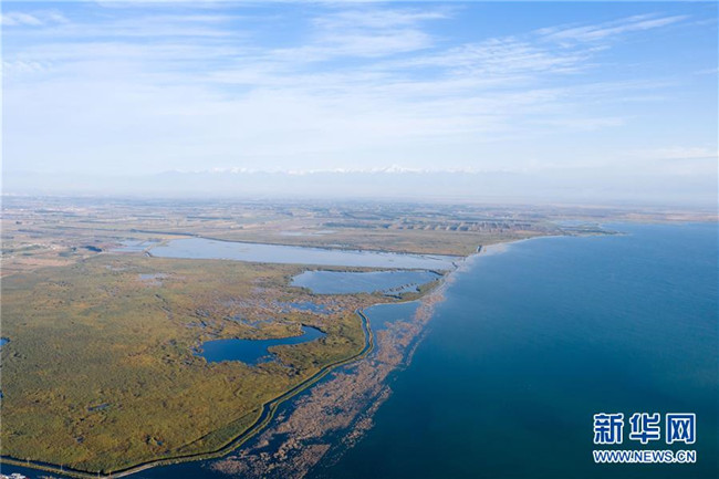 這是新疆博斯騰湖美景(10月12日無人機(jī)拍攝)。入秋以來,新疆博斯騰湖碧波蕩漾,美景如畫,吸引各地游客前來游玩。新華社記者丁磊攝