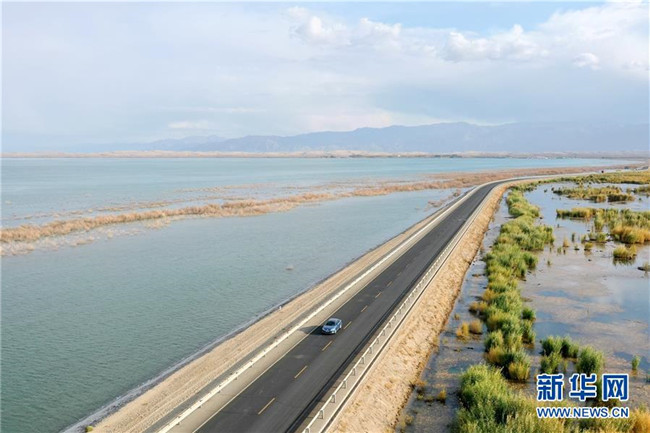這是新疆博斯騰湖河堤公路(10月12日無人機(jī)拍攝)。入秋以來,新疆博斯騰湖碧波蕩漾,美景如畫,吸引各地游客前來游玩。新華社記者丁磊攝