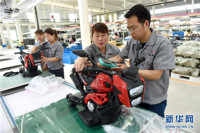 河北省邢臺(tái)經(jīng)濟(jì)開發(fā)區(qū)一家民營(yíng)玩具生產(chǎn)企業(yè)的工人對(duì)產(chǎn)品進(jìn)行出廠檢測(cè)(5月29日攝)。新華社記者 朱旭東 攝