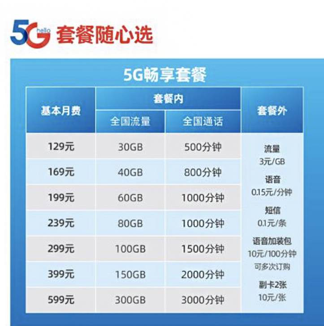 據(jù)記者了解,三大運營商5G套餐資費相差不大。中國移動5G套餐命名為“智享套餐”,分個人版和家庭版。其中個人版套餐從128元到598元、家庭版則從169元到869元,各有5檔。