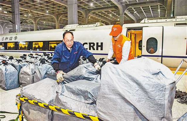 11月12日晚,重慶西站,工作人員正在卸載G8595次列車上的快件。為應(yīng)對(duì)“雙11”帶來(lái)的巨量物流,重慶鐵路部門利用高鐵動(dòng)車組、旅客列車行李車等運(yùn)力資源,提供物流服務(wù)。記者龍帆攝
