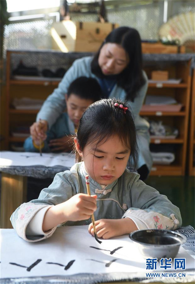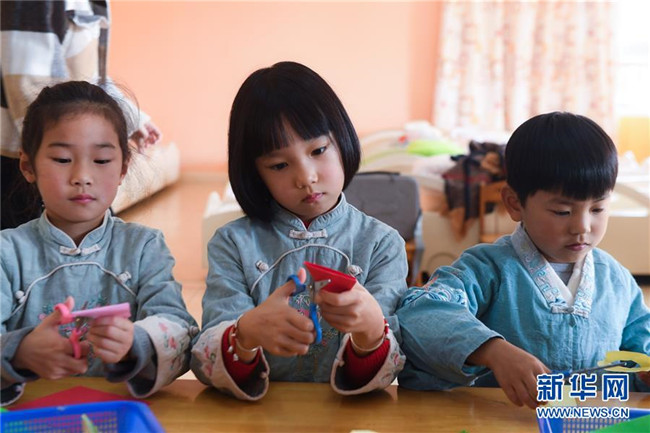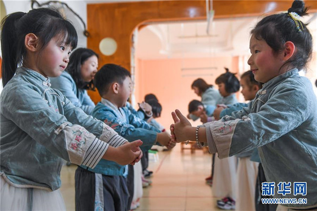 從2019年初開始,浙江省湖州市南太湖幼兒園開啟“國學課堂”,通過設立傳統(tǒng)禮儀、書法、剪紙、京劇、皮影戲等國學傳統(tǒng)文化課程,致力于將國學經(jīng)典教育滲透到幼兒日常生活學習中,培養(yǎng)幼兒的古典文化底蘊,教育幼兒從小培養(yǎng)良好的禮儀行為,讓幼兒們在傳統(tǒng)國學文化的滋養(yǎng)中成長。 新華社記者 徐昱 攝