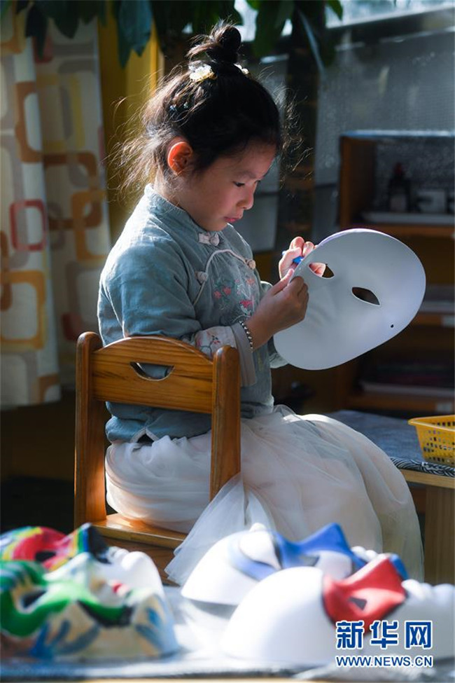 11月28日,小朋友在傳統(tǒng)書畫課上學習畫臉譜。