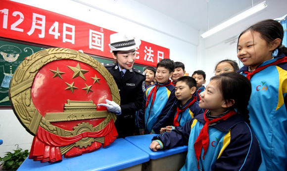 2019年12月3日,在第六個“國家憲法日”到來之際,山東省棗莊市公安局嶧城分局交警大隊一名交警在荀子小學(xué)為學(xué)生們普及憲法知識。吉喆 攝(人民圖片)