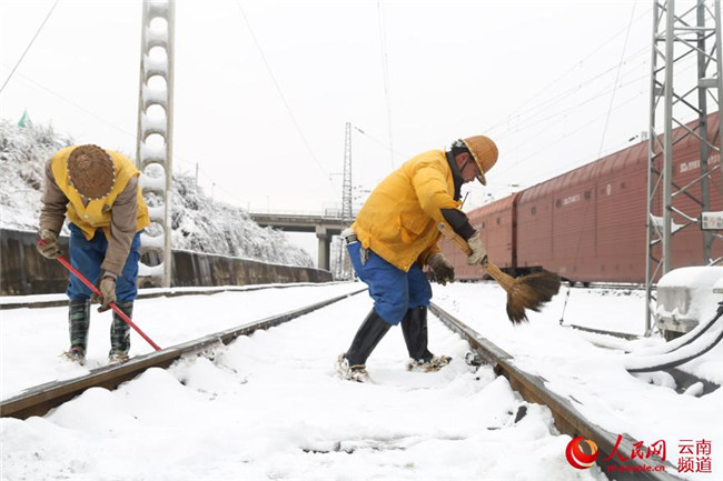 12月5日,云南省滇東北迎來今年以來首場(chǎng)降雪。昆鐵曲靖工務(wù)段及時(shí)啟動(dòng)大雪天氣應(yīng)急預(yù)案,成立除雪打冰隊(duì),加強(qiáng)道岔除雪除冰工作。攝影:楊永全