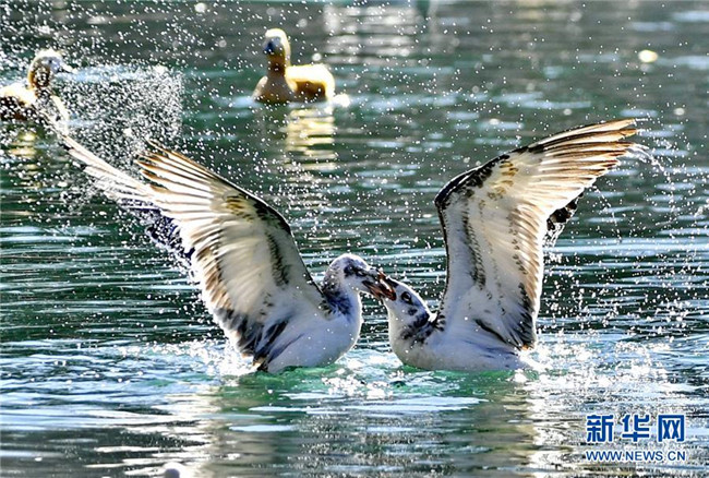 兩只紅嘴鷗在龍王潭公園的水面上爭(zhēng)食(12月20日攝)。新華社記者 張汝鋒 攝