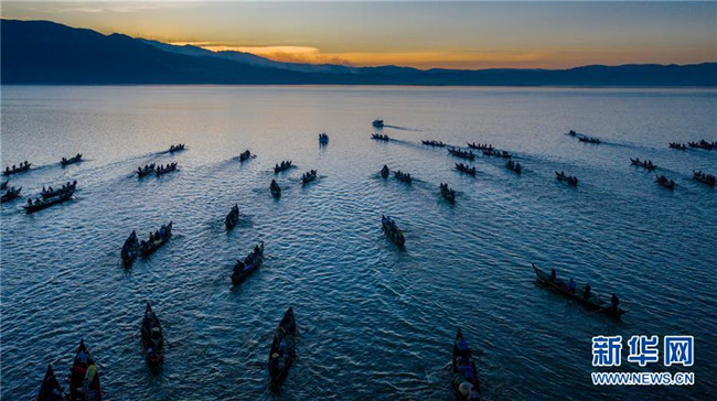 當(dāng)日,位于云南省玉溪市江川區(qū)的星云湖迎來一年一度的開湖捕魚季,600余艘漁船駛?cè)胄窃坪稉啤?星云湖是云南省九大高原湖泊之一,本次開湖捕魚時間將從2019年12月25日持續(xù)至2020年1月23日。 新華社記者 胡超 攝