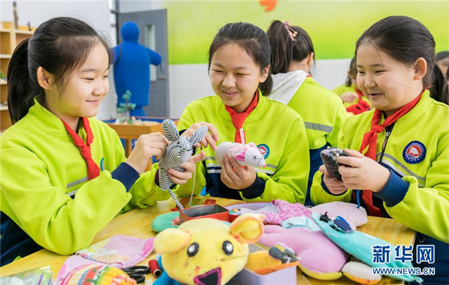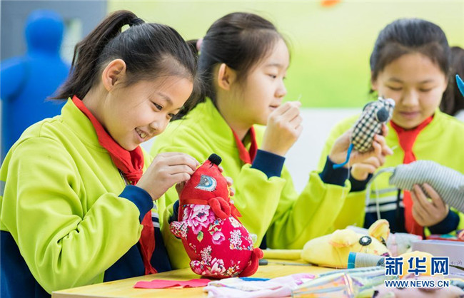 當日,內(nèi)蒙古呼和浩特市玉泉區(qū)通順街小學“巧手社團”的學生在老師的指導下,利用身邊的布頭、絲綿等廢棄物,制作生肖鼠布藝作品,表達對新年的美好祝愿。近年來,玉泉區(qū)教育部門大力推動“傳統(tǒng)文化進校園”活動,在當?shù)貙W校里開設(shè)剪紙、面塑、戲曲等民間藝術(shù)課程,讓學生感受傳統(tǒng)文化的魅力。 新華網(wǎng) 發(fā)(丁根厚 攝)