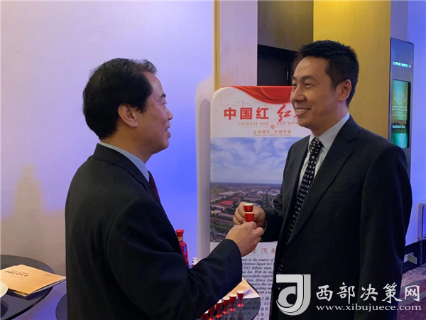 陜西西鳳酒營銷管理公司海外市場負責人閆紅斌代表企業(yè)向泰國國務院前副總理、泰中友好協(xié)會會長功·塔帕郎西贈送紅西鳳酒