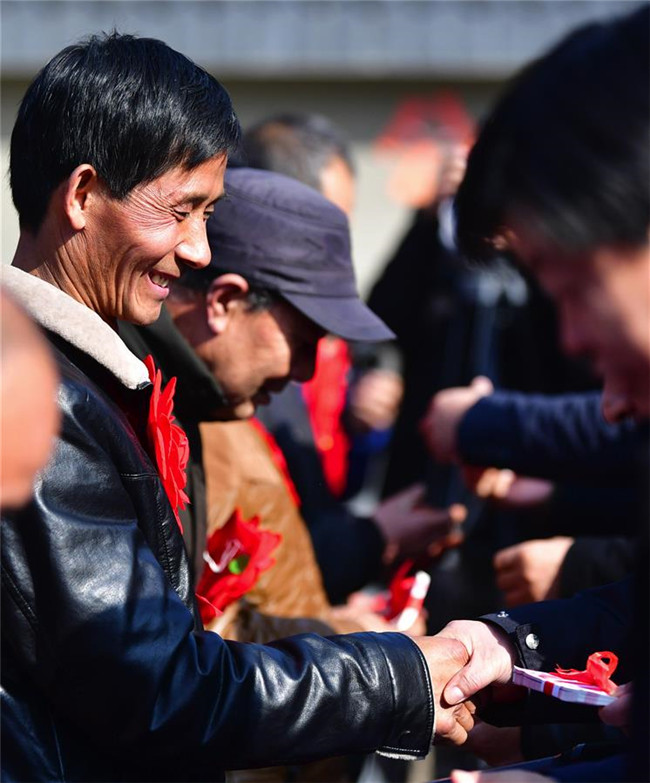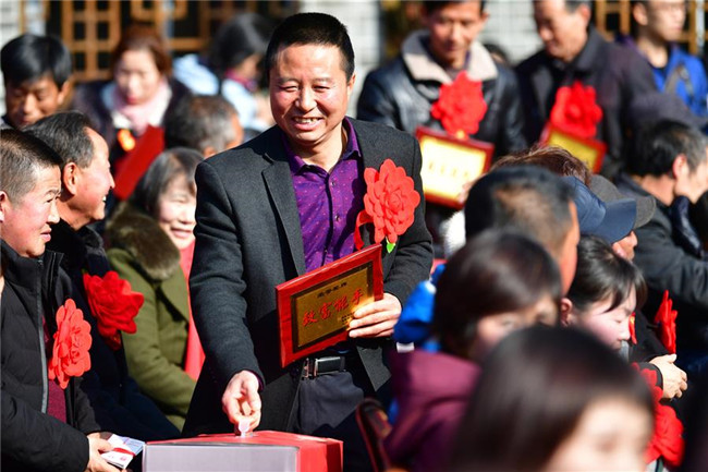 1月7日,村民尹新平在分紅大會(huì)上領(lǐng)到“致富能手獎(jiǎng)”。 新華社記者 陳斌 攝