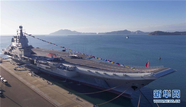 2019年12月17日,我國第一艘國產(chǎn)航空母艦山東艦在海南三亞某軍港交付海軍。經(jīng)中央軍委批準(zhǔn),我國第一艘國產(chǎn)航母命名為“中國人民解放軍海軍山東艦”,舷號為“17”。這是2019年12月15日拍攝的??吭诤D先齺喣耻姼鄣纳綎|艦(無人機照片)。 新華社記者 李剛 攝