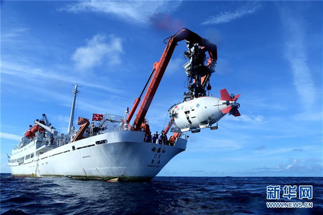 在西太平洋海域,“蛟龍”號載人潛水器離開“向陽紅09”科學(xué)考察船準(zhǔn)備進入水中,進行中國大洋38航次最后一潛(2017年6月13日攝)。 新華社記者 劉詩平 攝