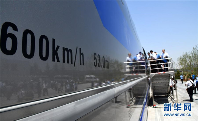 2019年5月23日,參觀人員在山東青島登上時速600公里高速磁浮試驗樣車參觀。 新華社記者李紫恒攝