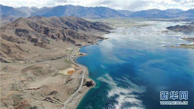 2019年8月3日拍攝的位于西藏阿里地區(qū)境內(nèi)的班公湖畔的公路(無人機(jī)照片)。 新華社記者 晉美多吉 攝