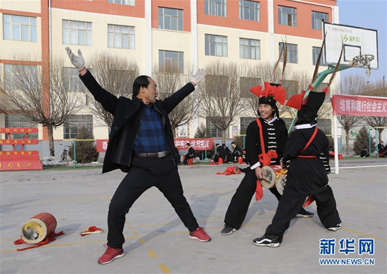 1月9日,在甘肅省武威市涼州區(qū)四壩鎮(zhèn)九年制學(xué)校,攻鼓子指導(dǎo)老師楊萬航(左)為學(xué)生示范動作。