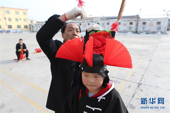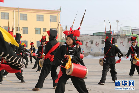 攻鼓子是發(fā)源于甘肅武威的一種民間鼓樂舞蹈,表演風(fēng)格渾厚豪邁、威武雄壯,具有強烈的地域特色。2008年,涼州攻鼓子被列為第二批國家級非物質(zhì)文化遺產(chǎn)。為更好地傳承這項非物質(zhì)文化遺產(chǎn),甘肅省武威市涼州區(qū)四壩鎮(zhèn)九年制學(xué)校組建攻鼓子藝術(shù)社團,開設(shè)攻鼓子校本課,定期由當?shù)毓ス淖哟硇詡鞒腥藢W(xué)生進行指導(dǎo),推動“非遺”攻鼓子藝術(shù)教育普及。 新華社記者 耿馨寧 攝
