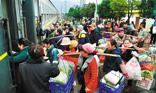 ▲停靠在湖南省麻陽郭公坪站的7272次列車,當(dāng)?shù)毓r(nóng)菜農(nóng)挑著擔(dān)子準備上車。這趟“慢火車”所經(jīng)過的地區(qū)多為“老少邊窮”,經(jīng)濟欠發(fā)達。為盤活沿途百姓致富渠道,鐵路部門開“綠燈”允許乘客攜帶大量鮮活貨物乘車。
