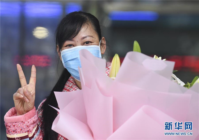 1月29日,在重慶三峽中心醫(yī)院,主管醫(yī)生向治愈患者蔣某送花表示祝賀。 新華社記者王全超攝