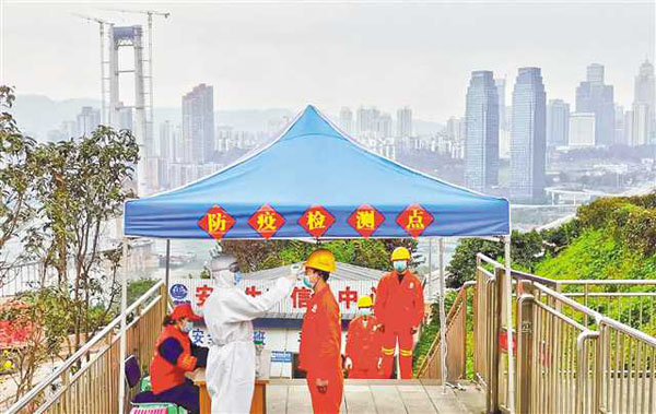 二月二十九日,在中鐵隧道三處重慶軌道交通十號(hào)線二期七星崗項(xiàng)目部,工人們正拉開間距排隊(duì)測(cè)量體溫后進(jìn)入工地。通訊員 周勇 攝