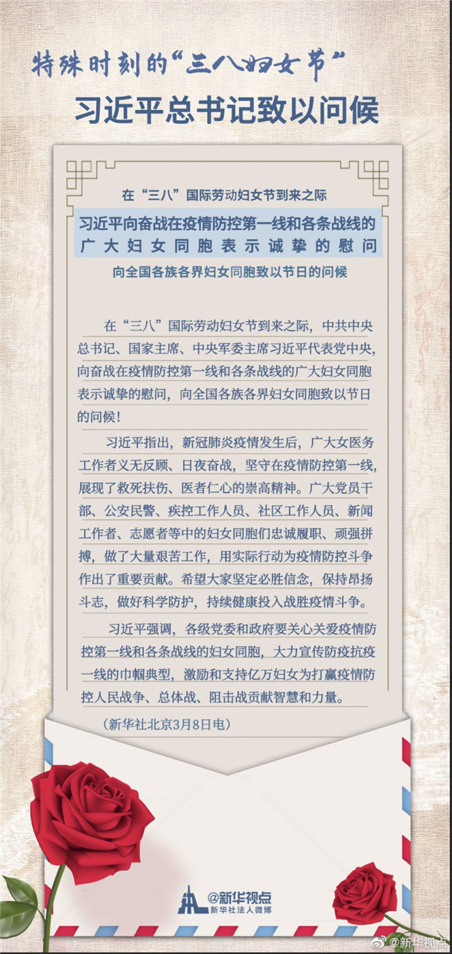 在“三八”國際勞動婦女節(jié)到來之際,中共中央總書記、國家主席、中央軍委主席習近平代表黨中央,向奮戰(zhàn)在疫情防控第一線和各條戰(zhàn)線的廣大婦女同胞表示誠摯的慰問,向全國各族各界婦女同胞致以節(jié)日的問候!