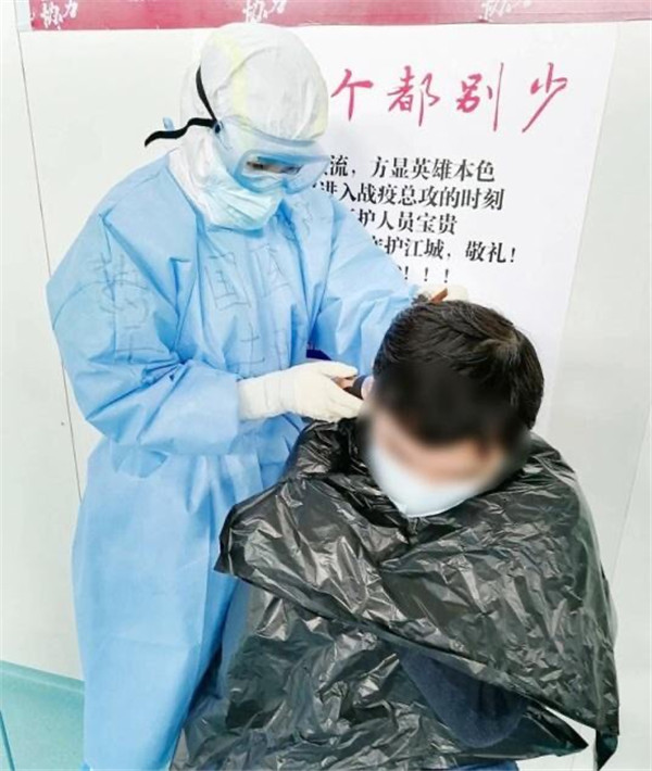 1艙有康復(fù)人員想理發(fā),手頭沒有工具,朱晴護(hù)士長(zhǎng)得知后,聯(lián)系下個(gè)班次護(hù)士帶來推子,給大家理發(fā)。“看你動(dòng)作很嫻熟啊,以前練過的吧”,“圍觀群眾”打趣道。“現(xiàn)學(xué)現(xiàn)賣,大家要求不要太高,有壓力?。?rdquo;朱晴說。一直推到推子沒電,朱晴給6位康復(fù)人員簡(jiǎn)單修剪了頭發(fā)。得知朱晴是西安醫(yī)療隊(duì)的護(hù)士,大家都親切的稱她“肉夾饃”!