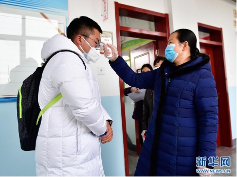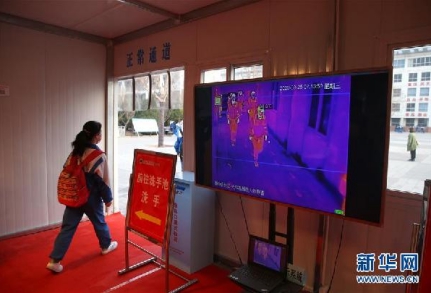 3月9日,在青海省海東市第二中學(xué),學(xué)生進(jìn)入教室前進(jìn)行測溫。