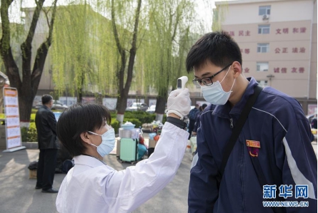 3月25日,在位于太原市財(cái)貿(mào)學(xué)校的太原市第五十三中學(xué)校高三教學(xué)點(diǎn),學(xué)生接受體溫測量。