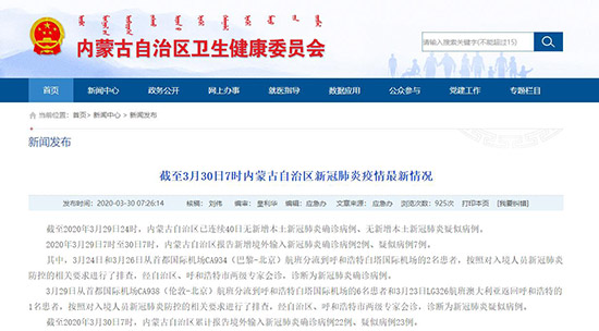 3月30日,記者從內(nèi)蒙古自治區(qū)衛(wèi)生健康委員會(huì)獲悉,截至2020年3月29日24時(shí),內(nèi)蒙古自治區(qū)已連續(xù)40日無(wú)新增本土新冠肺炎確診病例、無(wú)新增本土新冠肺炎疑似病例。