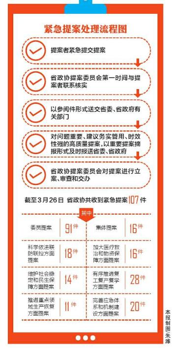 截至3月26日,省政協(xié)共收到關(guān)于新冠肺炎疫情防控及經(jīng)濟(jì)社會(huì)恢復(fù)發(fā)展的緊急提案107件,內(nèi)容涉及依法聯(lián)防聯(lián)控、加大醫(yī)療救治和物資保障、有序復(fù)工復(fù)產(chǎn)復(fù)學(xué)、維護(hù)社會(huì)穩(wěn)定和民生保障、完善應(yīng)急體系和機(jī)制建設(shè)等方面。