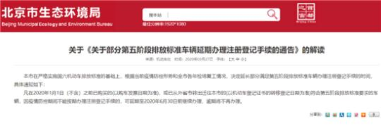 近日,北京市生態(tài)環(huán)境局發(fā)布《關(guān)于<關(guān)于部分第五階段排放標(biāo)準(zhǔn)車輛延期辦理注冊(cè)登記手續(xù)的通告>的解讀》指出,凡在2020年1月1日之前已購(gòu)買的、或已從外省市轉(zhuǎn)出遷往本市的符合“國(guó)五”排放標(biāo)準(zhǔn)要求的車輛,因疫情防控期間不能按期辦理注冊(cè)登記手續(xù)的,可延期至2020年6月30日前繼續(xù)辦理,逾期將不再辦理。