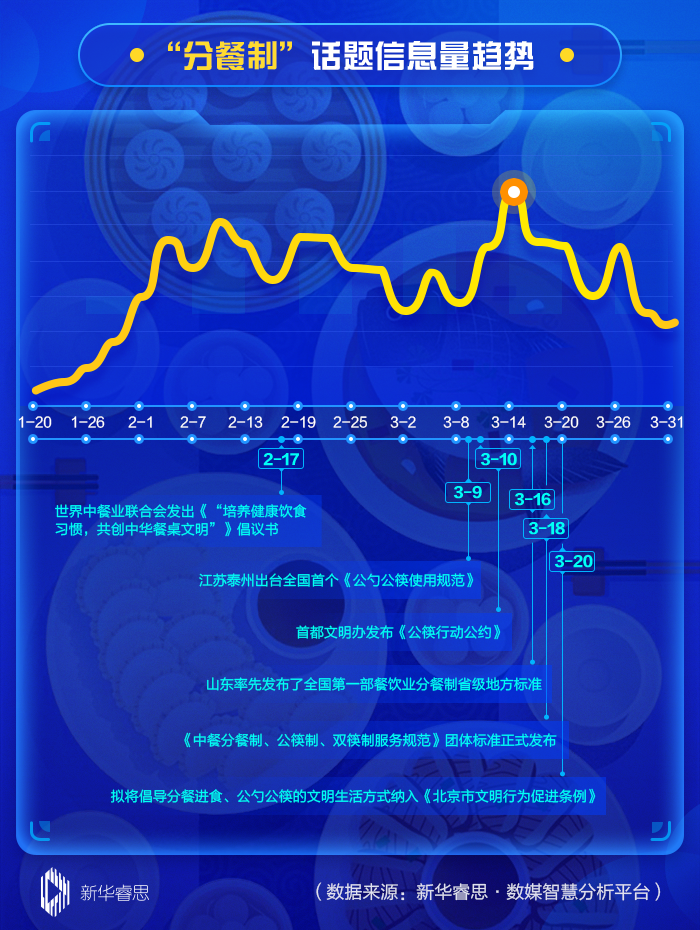 根據(jù)新華睿思·數(shù)媒智慧分析平臺數(shù)據(jù)顯示,在最近兩個(gè)月來,關(guān)于分餐制話題的關(guān)注度不斷上升,全國范圍內(nèi)信息量累計(jì)達(dá)到1039539條。其中,從話題趨勢演變圖看,3月14日達(dá)到輿論熱度的首個(gè)峰值(30183條),這與北京、江蘇泰州等地發(fā)布出臺關(guān)于公筷使用的文件直接相關(guān)。
