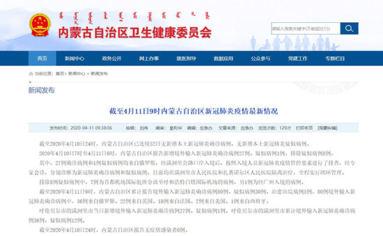 2020年4月10日7時至4月11日9時,內蒙古自治區(qū)報告新增境外輸入新冠肺炎確診病例27例、疑似病例1例。排除疑似病例8例。