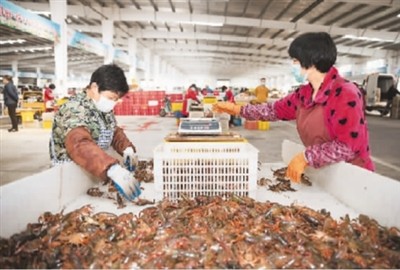 走進湖北潛江小龍蝦交易中心,眼前一派忙碌景象。500多家水產(chǎn)商戶已經(jīng)復(fù)工,工人們忙著分揀包裝,成箱的小龍蝦被裝上物流車輛,運往全國各地。