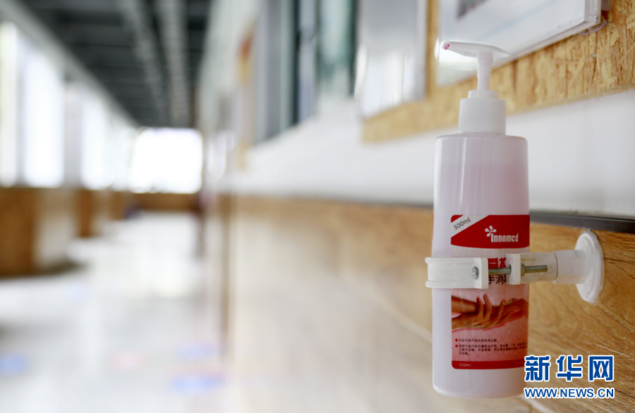 在教室、走廊、寢室等人流密集的場(chǎng)合,重慶市第十一中學(xué)配備了免洗消毒液供師生使用。新華網(wǎng) 彭博攝