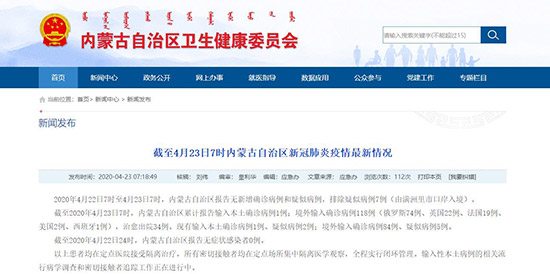 人民網(wǎng)呼和浩特4月23日電 (陳立庚)4月23日,記者從內(nèi)蒙古自治區(qū)衛(wèi)生健康委員會(huì)獲悉,2020年4月22日7時(shí)至4月23日7時(shí),內(nèi)蒙古自治區(qū)報(bào)告無(wú)新增確診病例和疑似病例,排除疑似病例7例(由滿洲里市口岸入境)。