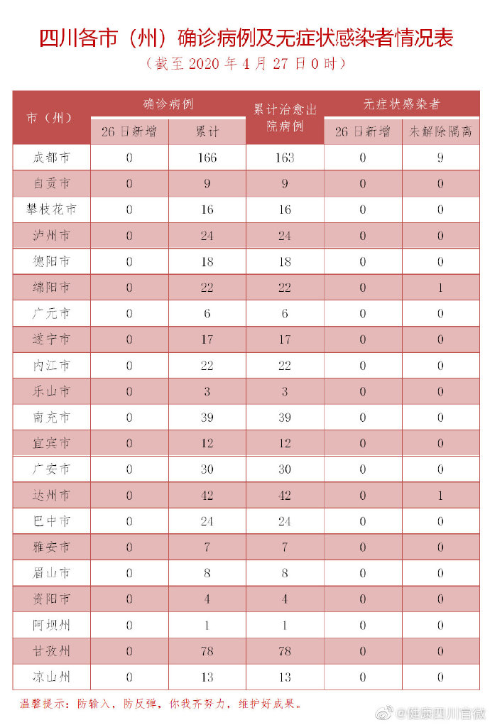 截至4月27日0時(shí),全省累計(jì)報(bào)告新型冠狀病毒肺炎確診病例561例,死亡3例,其余均于4月24日前全部治愈出院。其中,境外輸入確診病例21例,均于4月23日前全部治愈出院。