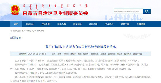 據(jù)內(nèi)蒙古自治區(qū)衛(wèi)生健康委員會5月8日發(fā)布的消息,2020年5月7日7時(shí)至5月8日7時(shí),內(nèi)蒙古自治區(qū)報(bào)告無新增確診病例、疑似病例。新增治愈出院1例(由滿洲里市口岸入境)。