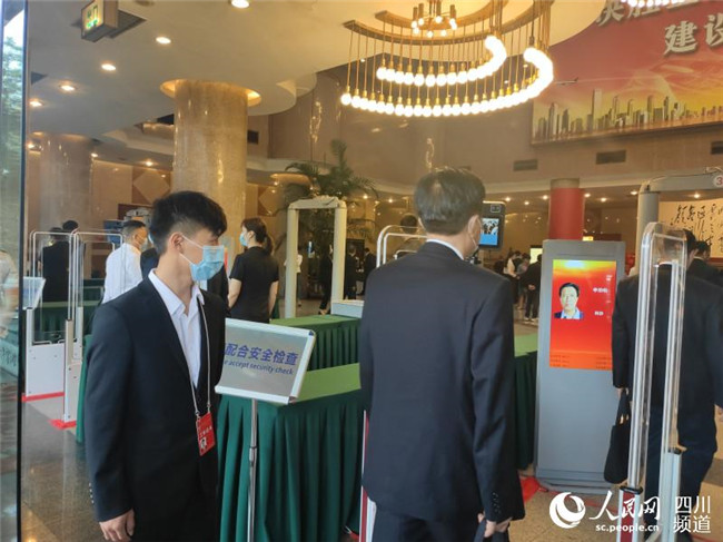 進入會場前,委員們在安檢通道接受紅外線測溫儀體溫檢測。郭瑩攝