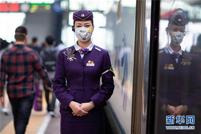 5月8日,在南京火車站站臺(tái)上,一名列車員戴著“笑臉口罩”迎接旅客上車。 當(dāng)日是世界微笑日。 新華社發(fā)(蘇陽(yáng) 攝)