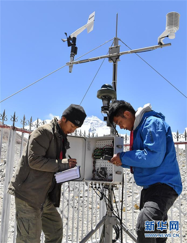 西藏自治區(qū)氣象局工作人員在珠峰大本營(yíng)自動(dòng)氣象站記錄氣象數(shù)據(jù)(5月10日攝)。新華社記者 普布扎西 攝
